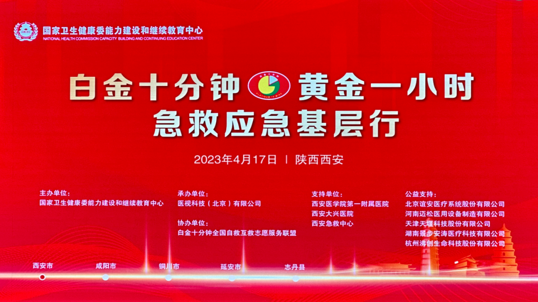 为进一步提高院前院内急诊救治水平,促进院前急救体系健康有序发展,搭建学术交流平台,4月17-21日,由国家卫生健康委能力建设和继续教育中心主办的“白金十分钟,黄金一小时”急救应急基层行陕西试点培训活动在西安站启动,途径咸阳—铜川—延安,在中国革命的“红都”志丹县圆满结束。